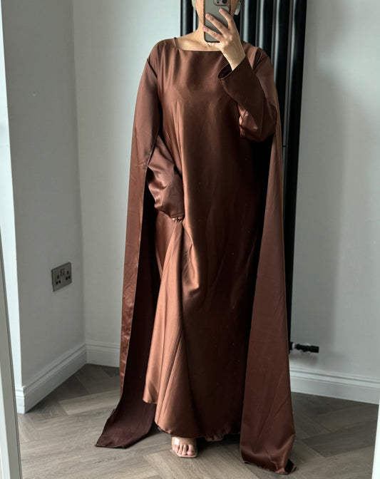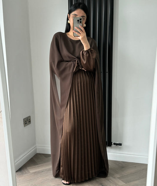 Haya Long Sleeve Pleated Maxi Dress with Cape In Brown