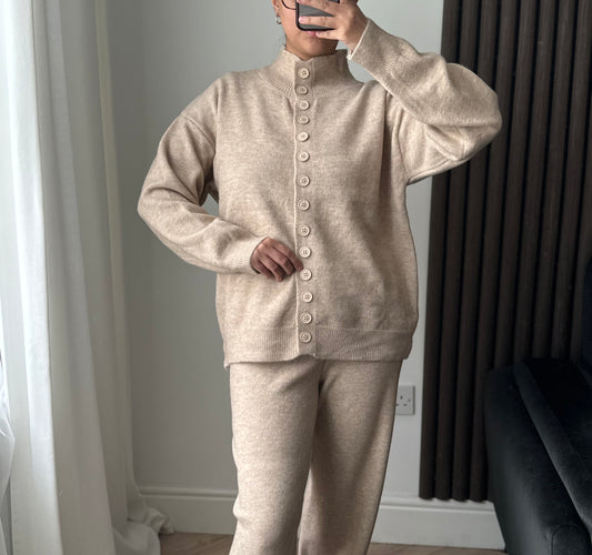 Cala Knitted High Neck Button Cardigan And Trouser Set In Beige