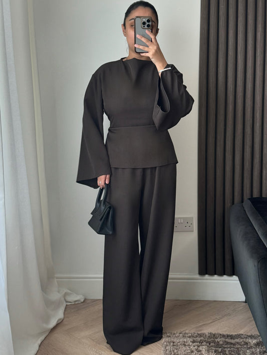 Esra Boat Neck Tie Back Top And Trouser Set In Brown