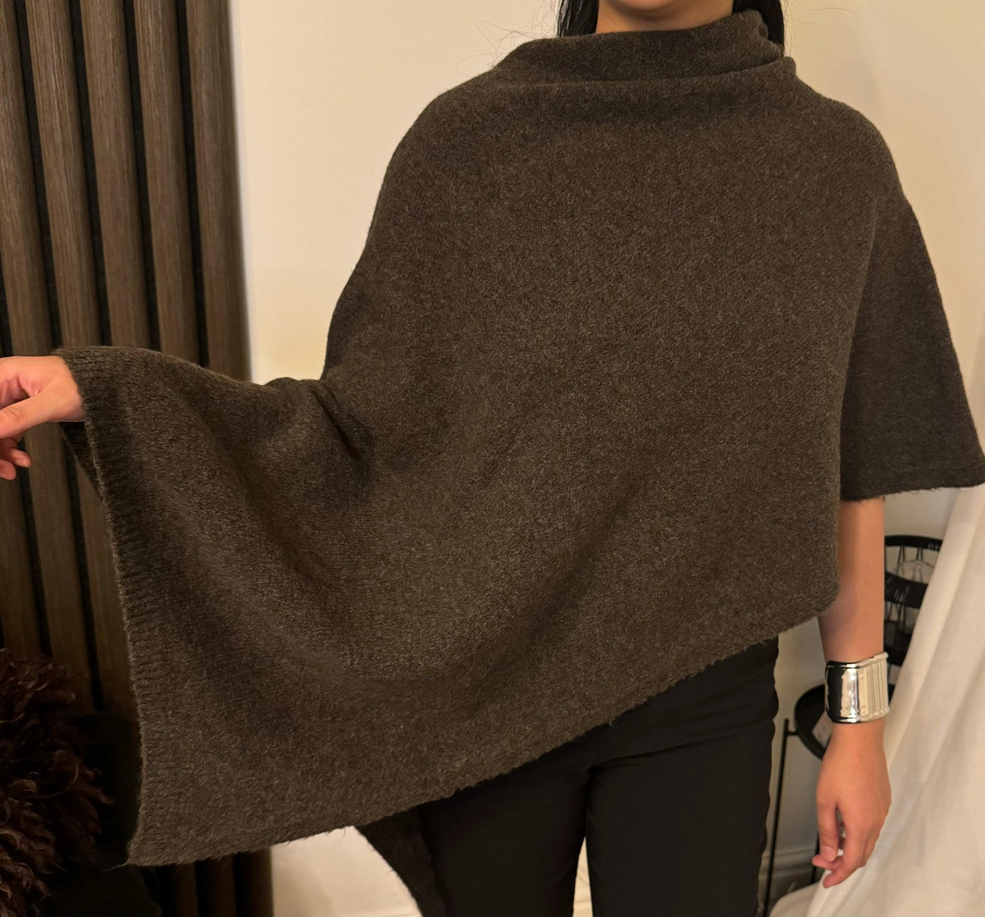 An effortless poncho with a modern asymmetric cut. Soft, comfortable and perfect to dress up or for casual wear.