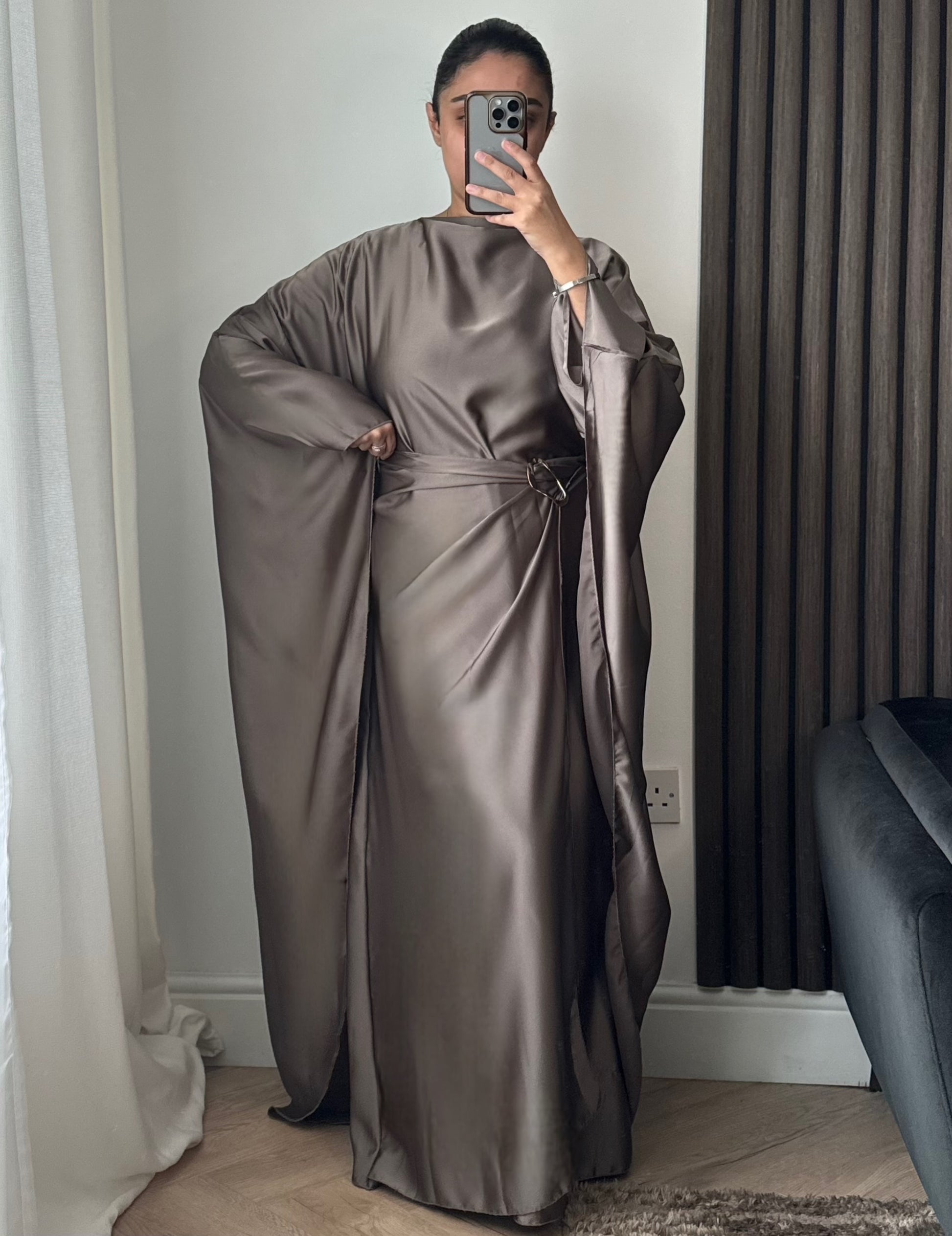 Effortlessly chic, this cape-style dress features a clean, flattering silhouette with a soft cape flowing entirely down the back and a gold tone belt detail.